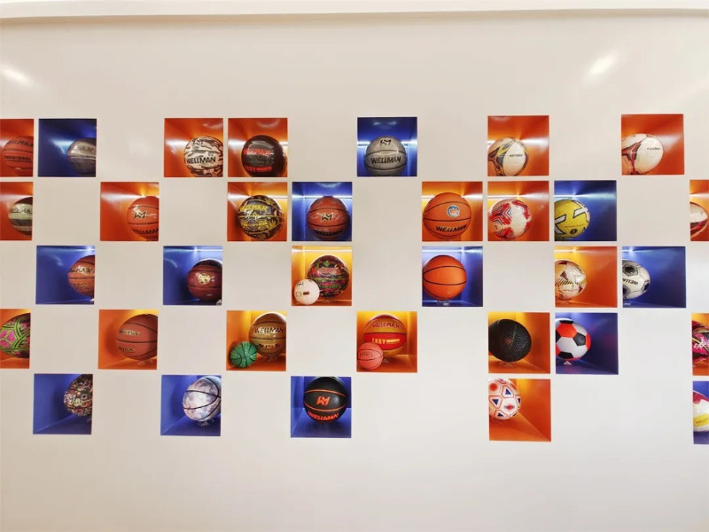 In de productshowroom van Meidong Sports zijn er tientallen basketbal-, voetbal- en volleybalproducten van verschillende stijlen en felle kleuren.